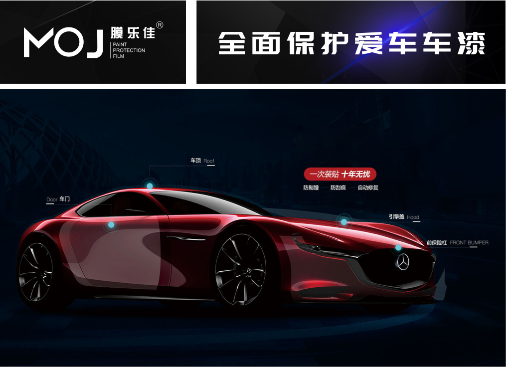 MOJ膜樂佳,全球知名品牌,專注于汽車漆面保護膜(隱形車衣)產品的研發與生產。產品均系原裝進口,全系列使用TPU材質,良好的耐天候性使其輕松應對光照、高溫、高濕等環境帶來的產品老化。